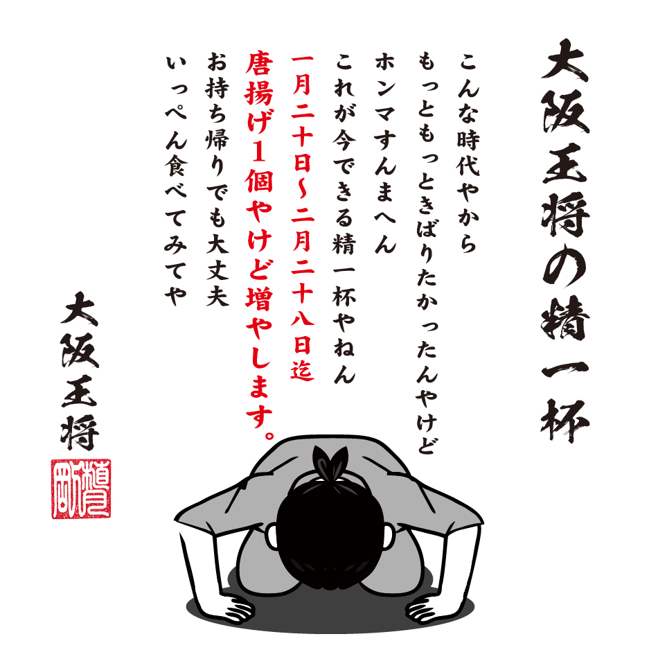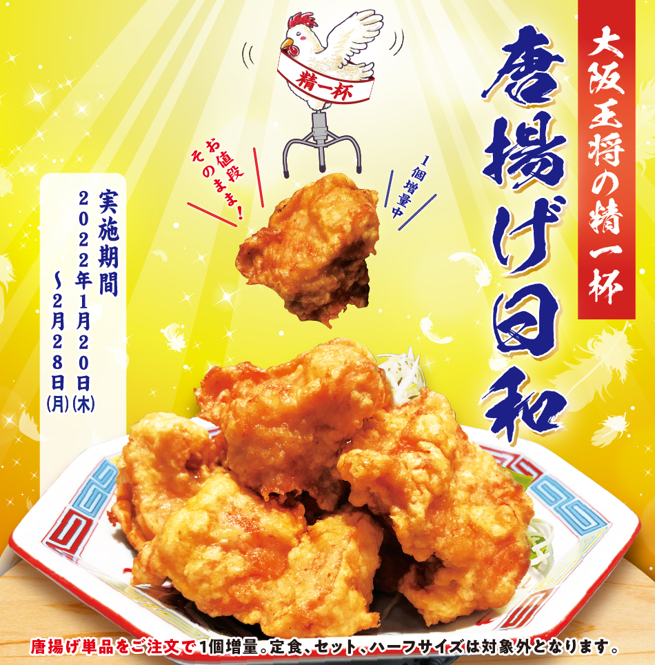 テイクアウト需要でますます人気の「唐揚げ」ですが、昨今の食材高騰により、お客様からは「大好きな唐揚げが食べれなくなってしまうのでは・・・。」といった不安のお声も挙がっております。大阪王将では、そんなお客様の不安感を少しでも和らげるために何かできないかとの想いで、唐揚げを一個増量する本キャンペーンを考案いたしました。今できる大阪王将の精一杯です。是非、この機会に大阪王将の「唐揚げ」をお楽しみください。